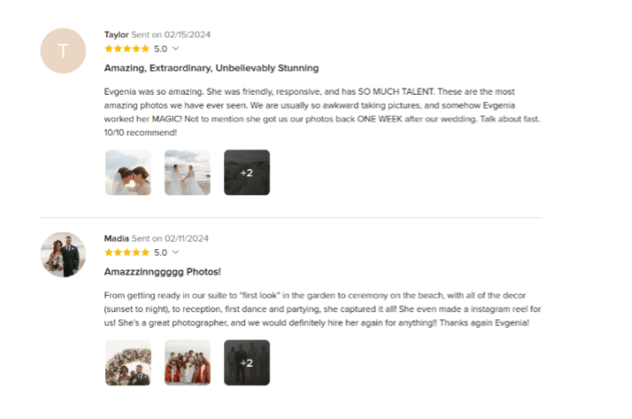 Evgenia was so amazing. She was friendly, responsive, and has SO MUCH TALENT. These are the most amazing photos we have ever seen. We are usually so awkward taking pictures, and somehow Evgenia worked her MAGIC! Not to mention she got us our photos back ONE WEEK after our wedding. Talk about fast. 10/10 recommend!